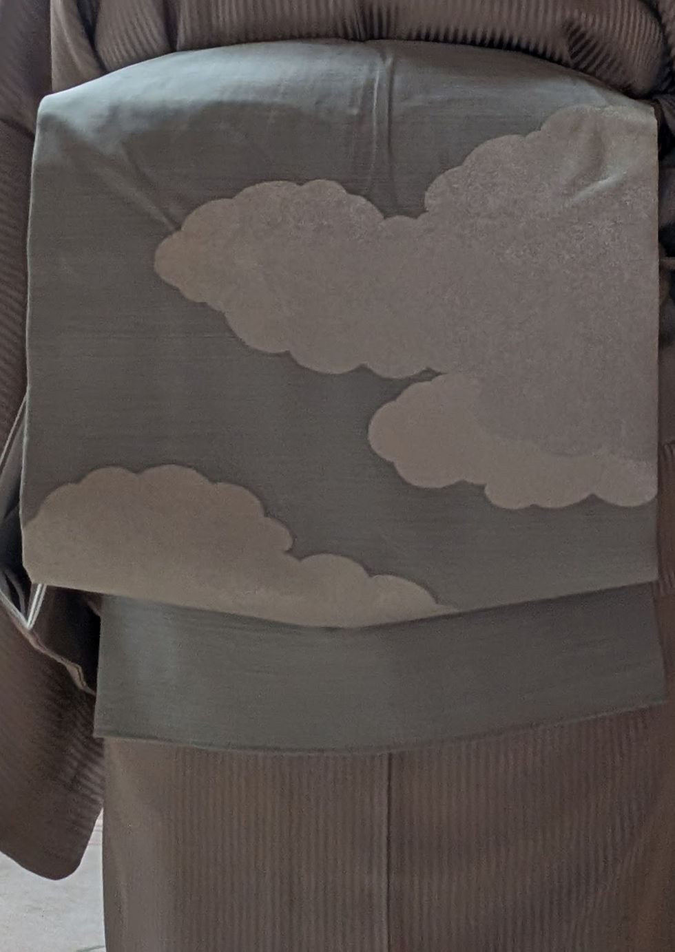 そして勝山健史さん制作の「卿雲」と名付けられた名古屋帯を合わせました。私はまだ仕立てる前のこの帯を初めて見たとき、ああ、夢のような布だなと思いました。そして小物は飛ばしてしまったほんのり桜色のものを。